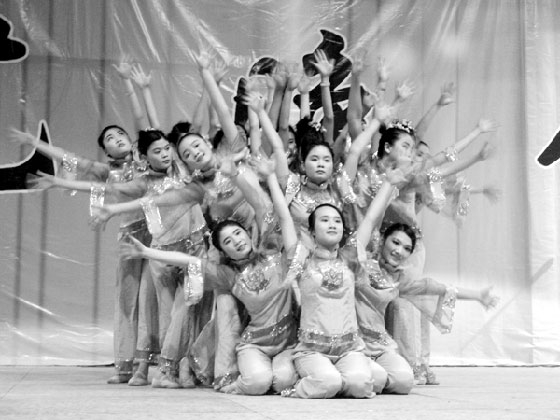 在2008年的鐘聲敲響之際,我市許多學校舉辦文藝活動,喜迎新年的到來。左圖為:在《同一首歌》的優美旋律中,河源中學校園文化科技藝術節暨2008年元旦文藝晚會拉開了序幕。合唱、舞蹈、口技、話劇、街舞、小品器樂等豐富多彩的節目,掀起晚會一浪浪高潮,充分展示了當今學生的藝術才華和張揚的個性。