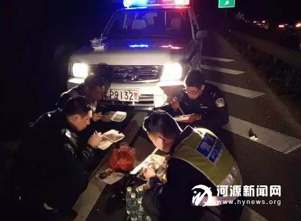 執(zhí)勤的交警餓了,便蹲在路邊吃飯。本報記者 刁城邦 攝