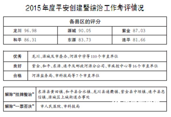 去年,我市平安創建暨綜治工作堅持圍繞中心、服務大局,維護了良好的社會治安秩序,保障了全市政治大局穩定,有效提升了人民群眾的安全感和滿意度。這期間,離不開各縣區及相關單位的不懈努力,按照各縣區及相關單位簽訂的2015-2016 年社會治安綜合治理責任書,市綜治委對各縣區及相關單位的工作進行嚴格細化、分點評分。最終龍川、源城及市委辦、河源中學等110 個市直單位被評為優秀;紫金、和平、東源、連平及郵政河源分公司、市疾控中心等16 個單位為良好;河源鹽務局、市科技局等7 個單位為合格。會議解除了對東源縣黃田鎮、和平縣合水鎮等6 個社會治安重點地區及相關突出治安問題掛牌整治,解除了對市人民醫院、市科技局2014年度社會治安綜合治理工作“一票否決”。