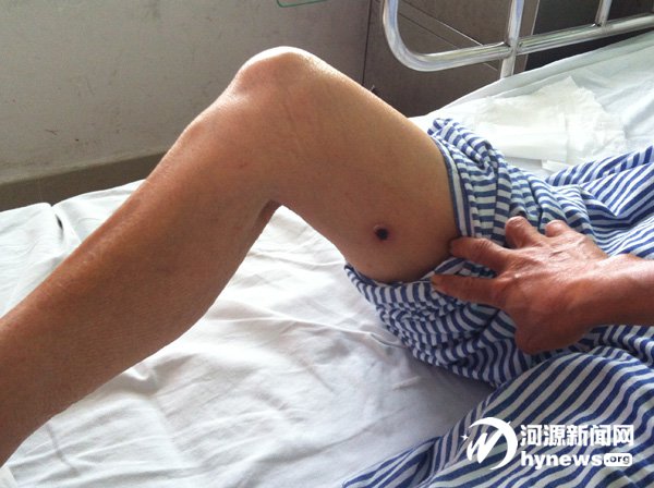 何阿婆腿上被恙蟲咬傷后的焦痂。