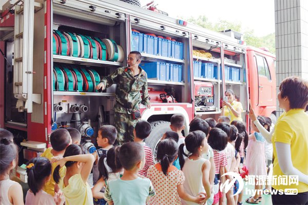當天,師生們參觀了消防車輛和器材。消防官兵用通俗易懂的語言進行消防知識講解和器材操作示范。之后消防官兵還邀請師生體驗了空氣呼吸器、登高平臺消防車等裝備,讓他們體驗了消防員們的日常生活。