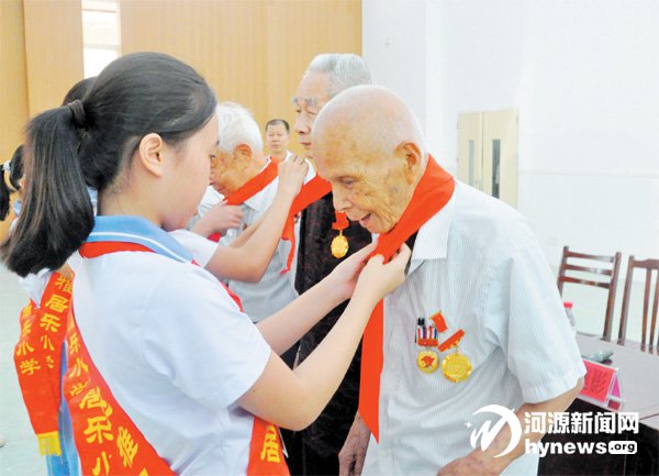 為迎接國慶節到來,并結合將于10月10日啟動的關心下一代工作宣傳月活動,昨日上午,“兩縱”市區老戰士聯誼會、源城區東埔街道辦事處在雅居樂小學舉辦“慶國慶文藝演出” 活動;顒又,老兵們為40名貧困生送上學習文具一批,鼓勵孩子們要珍惜生活及學習機會,努力成才報答社會。圖為學生們為老兵佩戴紅領巾。