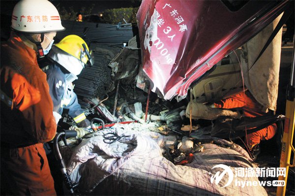 昨日凌晨4 時16 分,粵贛高速往深圳方向離城北出口2 公里處發生一起交通事故,一輛滿載鋼筋的大貨車追尾導致駕駛室兩人被困。源城消防文昌中隊接報后立即出動一輛搶險救援車,6 名指戰員火速趕往現場處置。消防救援小組利用鐵挺、液壓破拆組等救援工具對傷者進行營救。經過近50 分鐘的救援,被困人員被成功救出,移交給現場的救護人員救治。