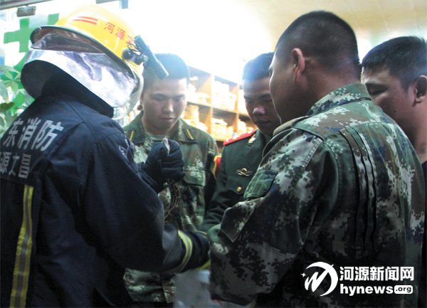 茶莊里面突然冒出一條蟒蛇!近日,市區長安市場對面一茶莊里突然來了一條蟒蛇,嚇壞了店主,店主無奈之下不得不向文昌消防中隊官兵求助。為了防止蟒蛇咬傷周圍群眾,避免驚動蟒蛇,消防官兵迅速來到現場為店主解除了困擾。據了解,此類蟒蛇屬于國家一級保護動物。當晚,消防官兵將蟒蛇移交給森林公安放生。