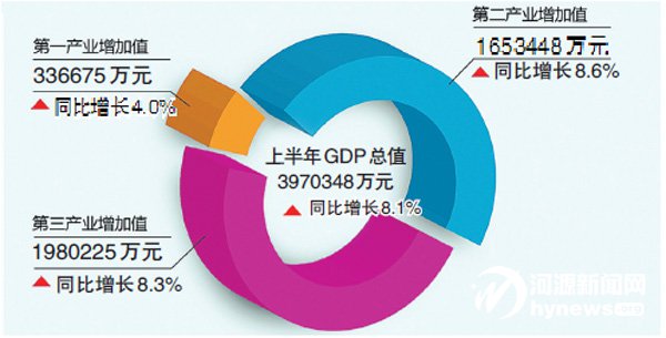 本報訊 記者 謝素嬋 昨日,市統計局公布今年上半年我市經濟運行統計情況。記者獲悉,今年上半年,全市經濟保持了“總體平穩、穩中有進”的發展態勢,全市實現地區生產總值(GDP)397.03 億元,同比增長 8.1%,增速分別比全國(6.7%)、全省(7.4%)快1.4 和0.7 個百分點,在全省各地級以上市排第3位。