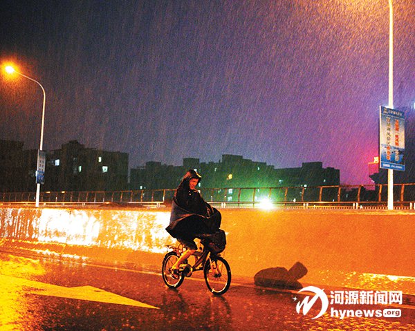 一名騎自行車的市民在雨中艱難前行。昨日是中國民間傳統(tǒng)節(jié)日“七夕”,但天公不作美,昨晚8時許市區(qū)及東源仙塘片區(qū)突降暴雨,持續(xù)近1個小時的大雨讓不少情侶“亂了陣腳”。市氣象部門當(dāng)晚8時將暴雨預(yù)警信號升級為橙色,提醒廣大市民請注意防御強(qiáng)降水及其衍生災(zāi)害。
