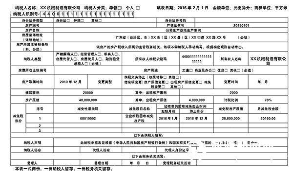 某機械制造有限公司,納稅人識別號 44001111111111111111,擁有一處生產基地,總建筑面積20000 平方米,房產原值40,000, 000 元,其中2000 平方米出租給某物流公司使用,出租部分原值4,000,000 元。該機械制造有限公司目前生產經營困難,已申請減免房產稅,并得到稅務機關審核通過,減免幅度為80%,減免稅房產原值為28,800,000 元 (36,000,000*0.8)。