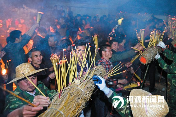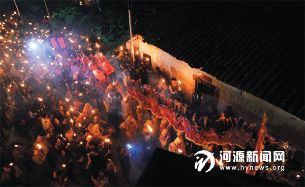 東源縣船塘鎮(zhèn)林屋村全村老少拿著火把,跟隨香火龍出發(fā)。