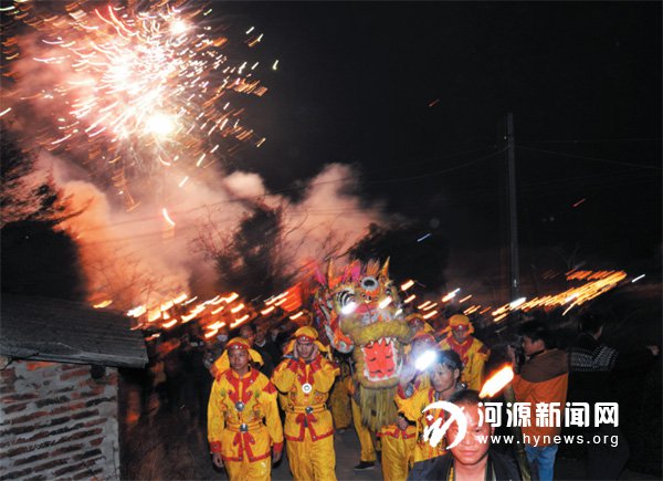 正月十三日晚,東源縣船塘鎮(zhèn)林屋村,舉村追火龍,歡慶添丁之喜,祈禱風(fēng)調(diào)雨順,人丁新旺。追火龍是林屋村傳統(tǒng)民俗活動(dòng)——開燈節(jié)的重要環(huán)節(jié)之一。晚上7時(shí),隨著長者的一聲令下,全村老少拿著火把,跟隨香火龍出發(fā)。追火龍的人群浩浩蕩蕩,香火龍所到之處,每家每戶都以放鞭炮、煙花迎接,祈盼來年風(fēng)調(diào)雨順、丁財(cái)兩旺。香火龍到達(dá)山頂回到祠堂,村民競相在祠堂上香祭拜,村民們開始搶龍身上的香火和祠堂上懸掛的花燈,并將搶到的香火和花燈上的利是帶回家,以圖一個(gè)好意頭,祈愿來年身體健康。