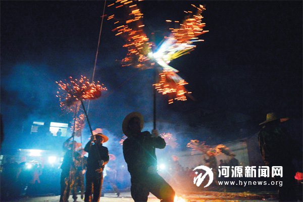 東源縣燈塔鎮(zhèn)高車村,在煙花的映襯下,追香火龍活動(dòng)格外喜慶熱鬧。