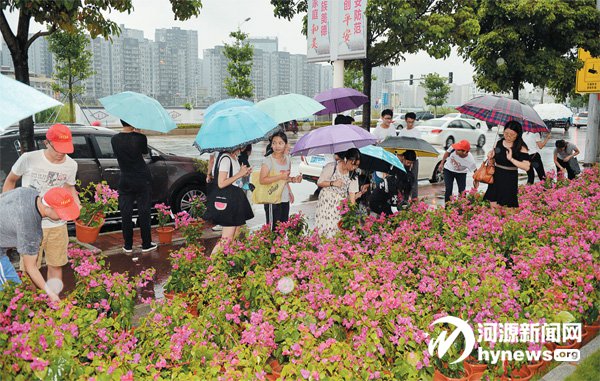下午4 點,暴雨如注,卻阻擋不了大學生志愿者們的熱情。在市健身廣場,大學生志愿者們冒雨前來領取勒杜鵑,市民也紛紛前來領花,共1000 盆勒杜鵑被大學生志愿者和市民抱回了家。