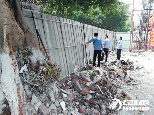 城管執(zhí)法人員正在拆除鐵皮圍欄。