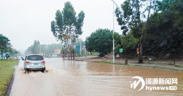 在市區東環路河源衛校和技師學院路段,早上八九時是積水情況最為嚴重的時候。積水漫過綠化帶淹沒街道,現場似一片“汪洋”。據技師學院一名保安反映,當時幾乎沒有學生外出走動,公交車也避開了此路段,在積水較少的地方讓乘客上落。