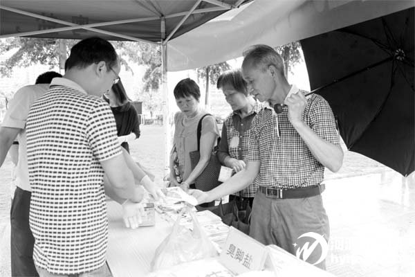 工作人員教市民如何識別放心鹽和“臭腳鹽”。