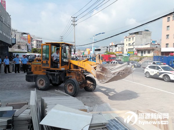 16 日早上8 點,公安、城管、公路、工商、東埔街道辦事處、源西街道辦事處等部門共計300 多名工作人員,來到了白嶺頭火車橋附近路口,準備開展整治行動。根據布置,行動人員分為兩組行動,按照創文的標準,對205 國道白嶺頭至東源路段雙向進行整治。