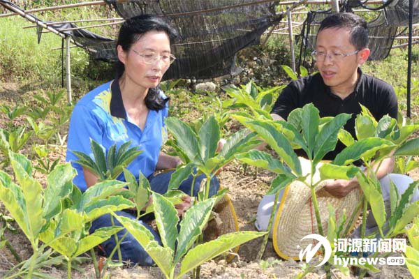 朱華飛(左)在魔芋基地察看魔芋長勢。