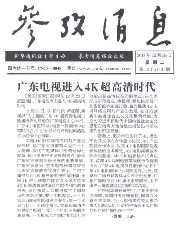 參考消息刊文:廣東電視進(jìn)入4K超高清時(shí)代