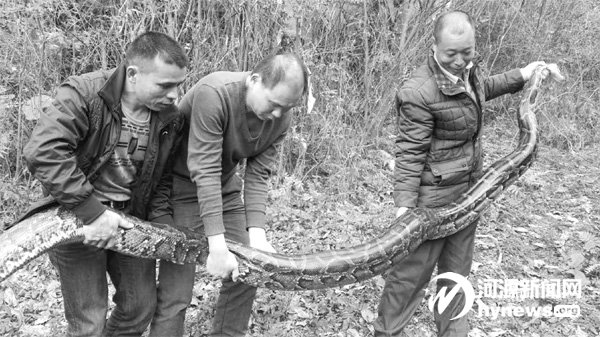 日前,東源縣漳溪鎮(zhèn)鵲田村村民在自家屋前草叢發(fā)現(xiàn)一條蟒蛇,在鄰居幫助下合力逮住了該蟒蛇,當(dāng)?shù)亓謽I(yè)等部門到達現(xiàn)場后,通過稱量發(fā)現(xiàn)這條長4 米的蟒蛇重達71 斤。