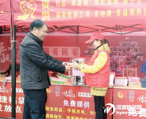 2017 年河源市“青春情暖團暖歸途·春運志愿服務”公益活動啟動,該活動由由團市委、中國石化河源分公司、河源樂天社志服務隊聯合開展,春運期間志愿者將在定點驛站為沿途的市民、司機提供志愿服務。