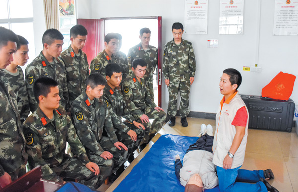 市紅十字會(huì)醫(yī)護(hù)人員根據(jù)多年經(jīng)驗(yàn)把一些急救常識(shí)向官兵們進(jìn)行了細(xì)致地講解,并與他們進(jìn)行了互動(dòng)問(wèn)答。隨后,官兵們按照培訓(xùn)內(nèi)容進(jìn)行了實(shí)際操作。