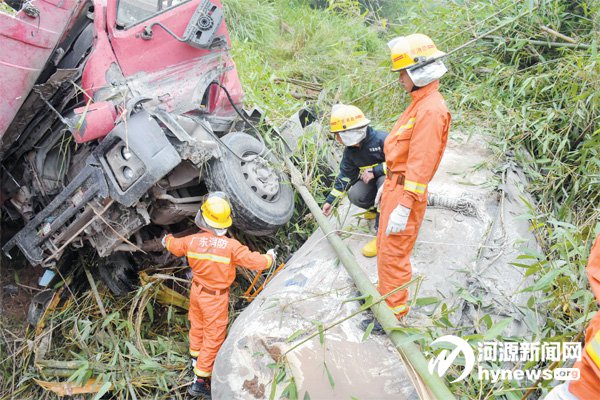 前日,和平縣大壩鎮(zhèn)往江西方向一輛運載水泥的貨車不慎沖出路面,連人帶車翻倒在山底,司機被困車中。