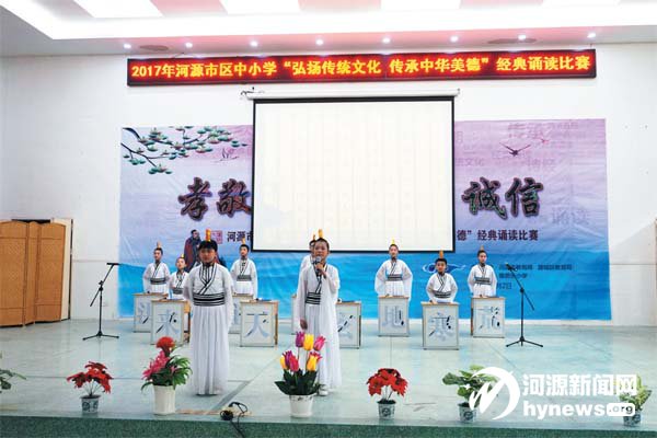 2 日,由市教育局、源城區教育 局聯合主辦的河源市區中小學“弘 揚傳統文化 傳承中華美德”經典誦 讀比賽在雅居樂小學舉行,共有 19 支隊伍參加了本次比賽。