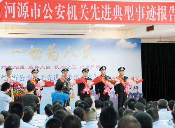 為弘揚英模精神,昨日下午,市公安局召開全市公安機關先進事跡報告會,獲評“全國優秀公安局”的源城公安分局、“全國優秀公安基層單位”的市強制隔離戒毒所、“全國特級優秀人民警察”的市公安巡警支隊支隊長袁作平、“全國優秀人民警察”的市強制隔離戒毒所所長肖東森分別向全市公安、武警、消防、森林公安民警作報告。