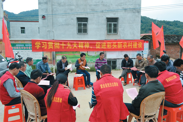 紫金“紅馬甲”小分隊在離縣城70 多公里的南嶺鎮武頓山下為正在勞作的村民們宣傳十九大報告精神。連日來,紫金縣組織“十九大報告精神宣傳小分隊”為轄區內的貧困村村“兩委”干部和黨員群眾講解十九大報告。小分隊5人一組,將收集的十九大報告相關內容印成通俗易懂的宣傳單,走村串戶流動宣傳黨的新政策、好消息,幫助黨員群眾了解十九大報告精神。