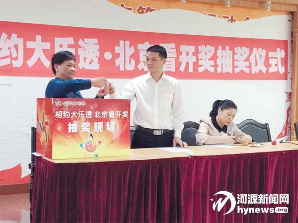 10 月31日,河源市體彩中心舉行“相約大樂透, 北京看開獎”公開抽獎活動。本次活動是在部分網點業主、部分彩民及我市新 聞媒體記者共同見證下,公開抽出10 位幸運彩民,將 于11月12日赴北京現場觀看大樂透開獎。據悉,幸運彩民是從9 月15 日至10 月 21 日在河源市體彩任一網點購買大樂透復式票36 元 (含)以上或者購買大樂透 單張彩票50 元(含)以上的 彩民中抽選出的。