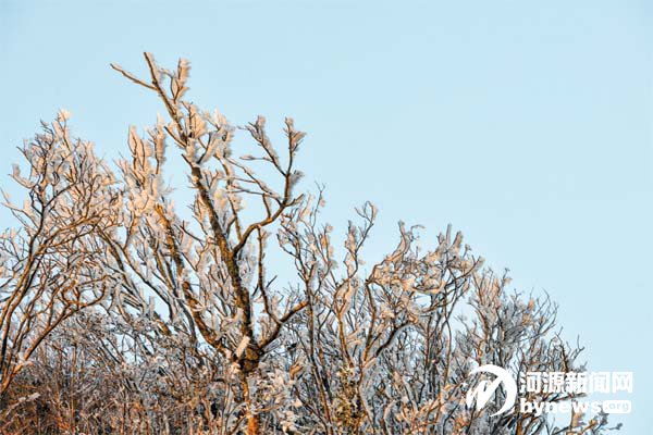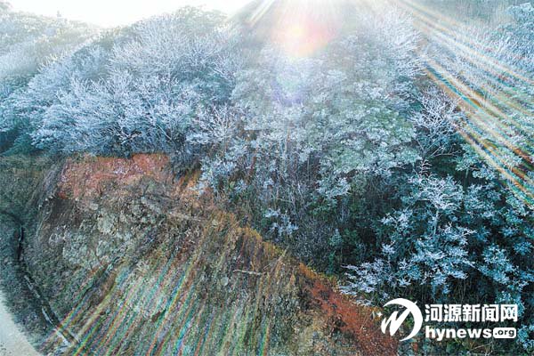 昨日,受強冷空氣影響,我市多個地區(qū)迎來入 冬以來的第一場壯觀霧凇,在龍川、連平、東源等地 呈現(xiàn)銀裝素裹,樹上、小山坡上處處披上了銀裝,分 外妖嬈。昨日凌晨4 時,本報記者從市區(qū)出發(fā),驅(qū)車 近兩個小時到達東源縣曾田缺牙山,天亮之前,山上 寒風蕭瑟,山頂氣溫低至零下1 度,早晨6 時20 分左 右,初升的太陽慢慢解開了冰凍天氣下的山頂,這里 出現(xiàn)了霧凇美景,不少好奇的 市民和攝影愛好者紛紛前來觀 賞、拍攝,以此留照紀念。