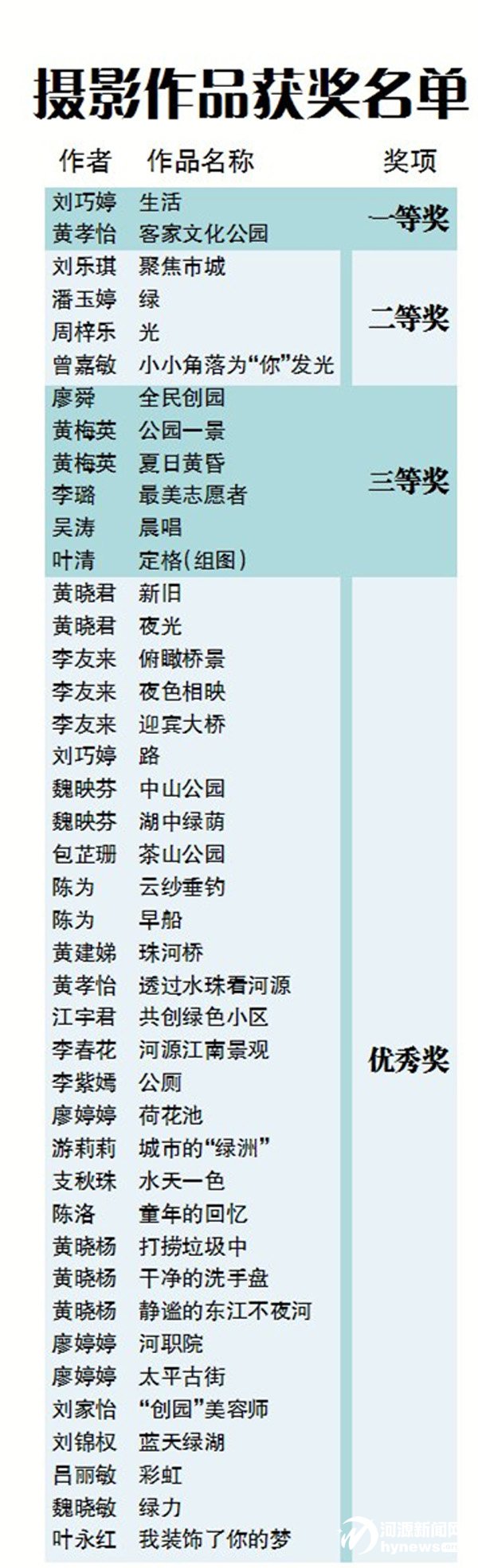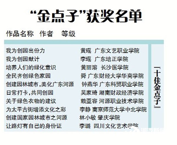 本報訊 記者 劉影麗 “創園金點子”征集活動、“創園”征文活動、“聚焦創園,美麗家園”大學生攝影活動等三大征集作品評審結果出爐啦!1 月10 日上午,由市創園辦、市城管局、河源晚報社聯合主辦的以創建全國園林城市為主題的三大征集活動進入終審,經過市創園辦、河源晚報社、市作家協會、市攝影家協會等部門專業人士組成的6 名評審團的評審,分別評選出了“十佳金點子”,攝影作品一、二、三等獎及優秀獎,征文作品一、二、三等獎。