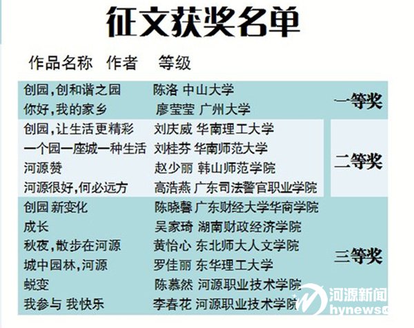 他說,通過評閱大學生志愿者的征文作品,他看到許多學生都很熱心,有傳統文化的沉淀,也有一定的文學基礎。例如,有一位學生寫了我市保潔員楊梅的感人事跡,弘揚河源在“創園” 過程中涌現的先進人物,動員每一個市民參與其中;有學生寫了自己和家人、朋友、同學到公園賞景,文章層層推進,反映河源 “創園”的成果和河源的美;有的學生恰當運用古詩詞、古人修建古建筑的事跡等,對河源“創園” 提出自己的觀點和看法……這一篇篇作品,都讓他欣喜。而與此同時,他也提到,有部分作品角度不夠新穎、存在同化現象,他建議大學生們要多看古今中外的名著,提高自己的寫作水平。