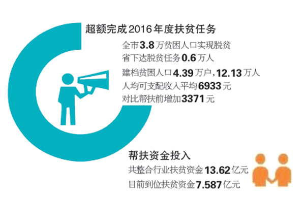 全市農村建檔貧困人口4.39 萬戶12.13 萬人。2016 年我市建檔貧困戶人均可支配收入平均6933 元,對比幫扶前增加3371 元。