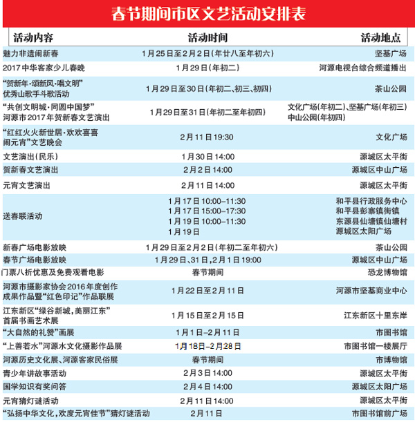 據悉,春節期間,我市將組織專業文藝團隊,深入到各縣區和鄉鎮,為市民送上豐富多彩的文藝演出。春節期間,我市堅基廣場、文化廣場、茶山公園、源城區太陽廣場、中山廣場、太平街等地,都將舉行賀新春、元宵文藝演出活動。1 月17 日和19 日,我市還將組織專業人員進到縣區舉行義寫義送春聯活動,為老百姓免費寫春聯送春聯。同時,春節期間,我市各類攝影、書畫作品也將舉行展覽,讓市民“大飽眼福”。江東新區 “綠谷新城,美麗江東”首屆書畫藝術展、“上善若水”河源水文化攝影作品展、河源歷史文化展、河源客家民俗展等展覽,將在市圖書館、市博物館等相繼揭幕開展。