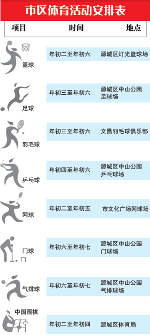 享用“文化大餐”的同時,市民們還可以在家門口欣賞到各種各樣的體育活動,在冬日里盡情地出出汗。從大年初一到十五,市文化廣場、源城區燈光球場、源城區中山公園等地以及各縣區將舉行籃球、乒乓球、羽毛球、門球、氣排球、網球和中國象棋等比賽。屆時,全市將掀起一場全民健身熱潮。