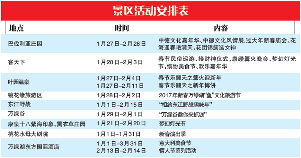 除了“文化大餐”及體育活動,我市各大景區也準備了形式多樣的活動讓廣大市民歡歡喜喜過大年。據悉,春節期間,巴伐利亞莊園、客天下、葉園溫泉、鏡花緣、東江野戰、萬綠谷、桃花水母大劇院等我市知名景區,將舉行各種迎新春主題活動,讓廣大市民和游客可以從美食到溫泉,從花海到劇院,從篝火晚會到夢幻燈光節,體驗風情各異的新春氛圍,帶來不同以往的新年之旅。