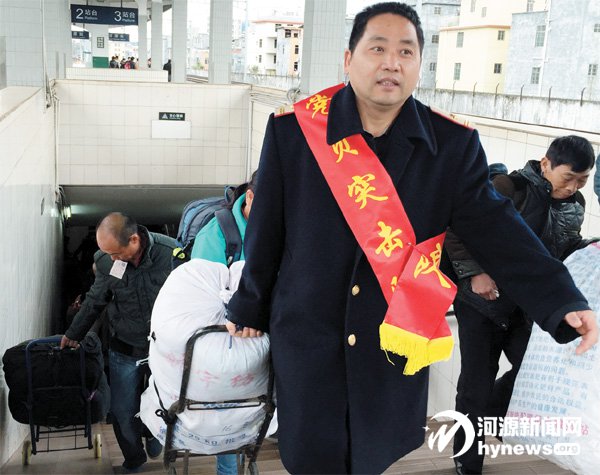 河源火車站黨員服務隊志愿者在候車室、進站口、站臺為準備踏上火車的乘客提供服務。吳奕鎮 黃靜 攝