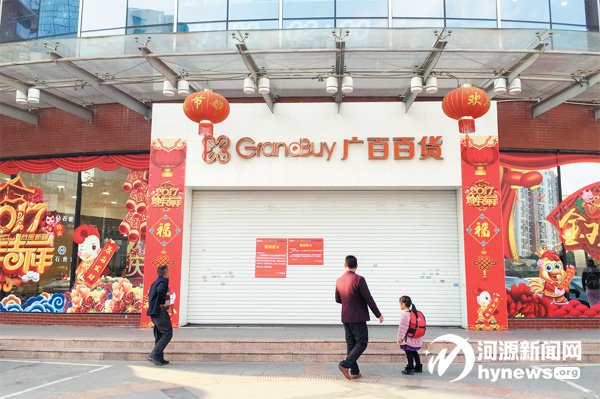 2 月13 日上午10 時(shí)許,記者來到位于建設(shè)大道的廣百,看到貼在廣百大門上的“溫馨提示”: “ 因內(nèi)部調(diào)整,廣百河源店于 2017 年2 月13 日起暫停營業(yè) ……”當(dāng)日,除現(xiàn)場工作人員與商家,廣百已禁止市民入內(nèi),不少尚未知情廣百即將結(jié)業(yè)的市民駐足,驚訝地看著廣百貼出來的結(jié)業(yè)告示。