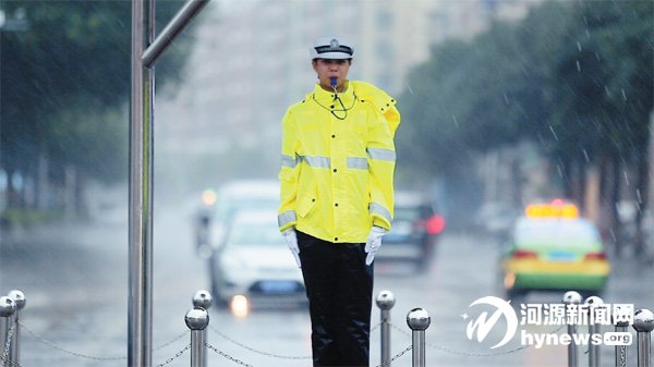 市公安局交警支隊江北女子中隊隊員在雨中執勤。無論是烈日高溫,還是暴雨寒風,每天她們都會精神抖擻踏上崗臺,堅守在道路上。
