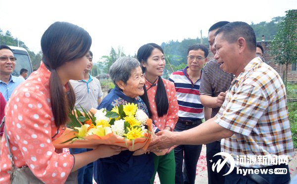 回到紫市鎮(zhèn)新南村后,鄉(xiāng)親們前來迎接,獻(xiàn)上鮮花。
