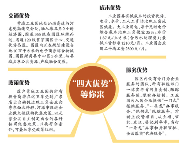 “水價1.87 元/立方米(含污水處理費);最低工資標準1210 元/月。工業(yè)園企業(yè)用工平均工資2500 元/月……”昨日上午,在紫城工業(yè)園基礎設施建設動工儀式,記者接過現(xiàn)場工作人員遞過來的宣傳單,仔細一看,宣傳單上所列的各項政策及服務項目讓人耳目一新,不單單是精準,而且相當詳細。記者注意到,就拿入園企業(yè)可享受的一些扶持政策來看,就包括建廠補貼、貼息上市扶持、產(chǎn)業(yè)共建獎補、創(chuàng)新扶持、達產(chǎn)達效扶持、技改扶持、科研成果獎勵等七大內(nèi)容,尤其是在工業(yè)園投資的成本優(yōu)勢更是計算得明明白白,地價、水價、電價、工價、運費、社保一目了然。