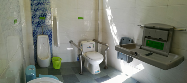 如果說兒童公廁的設(shè)置是方便了在公園游玩的孩子,那第三衛(wèi)生間的建造就是為了滿足市民的特殊需要,在特殊時候解除市民可能遭遇的尷尬。第三衛(wèi)生間,在國外也叫“第三空間”,主要目的是為了解決一部分特殊對象(不同性別的家庭成員共同外出,其中一人的行動無法自理)上廁所不便的問題,主要是指女兒協(xié)助老父親,兒子協(xié)助老母親,母親協(xié)助小男孩,父親協(xié)助小女孩等。據(jù)兒童公園公廁保潔員介紹,第三衛(wèi)生間里有兒童坐便器、成人坐便器、男性兒童與成人兼用的便器、母嬰護理臺,“就像是父親帶著年幼的女兒,不放心孩子一人進入女廁,而不管進入男廁還是女廁都挺尷尬的。另外,母親也可以在這里給孩子哺乳。”