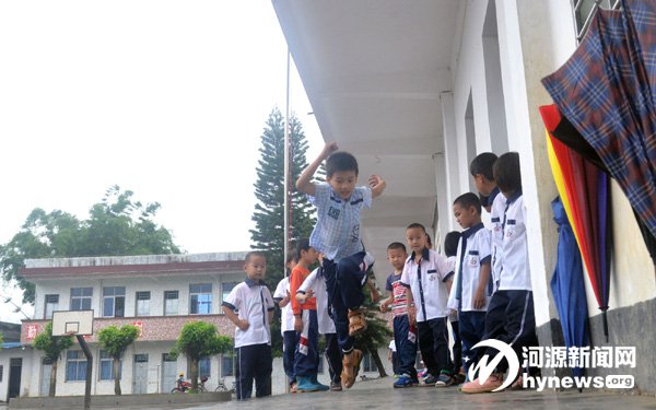 課余,孩子們只能在教室外玩一種“跳腳”的游戲。