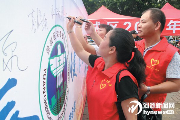 活動中,青少年代表帶領(lǐng)在場人員進(jìn)行了鏗鏘有力的禁毒宣誓。隨后,大家在拒毒橫幅上簽名,并觀看了禁毒圖片展、禁毒成果展示。在宣傳教育活動主會場客家文化公園,禁毒工作人員和禁毒志愿者耐心地向過往群眾廣泛宣傳毒品危害、傳授禁毒知識,接受群眾咨詢,播放禁毒視頻,并向群眾發(fā)放禁毒宣傳資料。