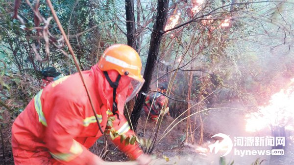 2015年10 月的一天,東源一鄉(xiāng)鎮(zhèn)突發(fā)山火。接到上級(jí)命令,黃孫映跟師傅周德粦一起按應(yīng)急預(yù)案帶領(lǐng)十多名隊(duì)員半小時(shí)急行軍抵達(dá)火場(chǎng)邊緣。有生以來,他第一次看到熊熊山火貪婪地舔噬著林木,火借風(fēng)勢(shì)肆意蔓延,山火卷起的濃煙足有幾十丈高,挨著火場(chǎng)邊,更是感到熱浪滾滾,“沒想到山火的破壞力如此之大,真正體會(huì)‘山火無情’這四個(gè)字的含義”。雖然發(fā)生山火的山海拔僅200 米,然山勢(shì)比較陡峭,黃孫映他們手腳并用,相互協(xié)作才艱難爬上山頂。大家來不及調(diào)整休息,面對(duì)熊熊燃燒的火海,只能迎面而上,撲火頭、打險(xiǎn)段、設(shè)隔離,火勢(shì)猛的地方就“重點(diǎn)突破”,火勢(shì)弱的地方就“分進(jìn)合圍”。花了一個(gè)多小時(shí),明火終于被撲滅了。有了第一次的實(shí)戰(zhàn)經(jīng)歷,他撲救山火的信心更足了。