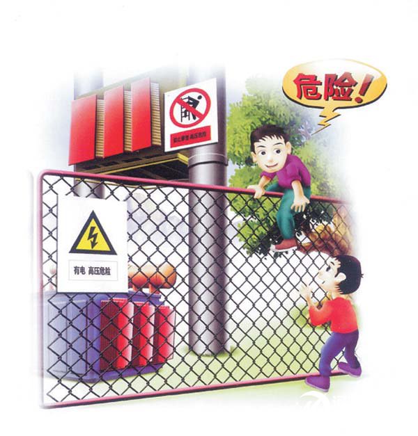 電力管理部門在戶外一些變壓器、電纜分支箱等設備 周圍設有安全圍欄,一是為了保證人群與設備保持安全距 離,二是在避免電力設備遭車撞等外力破壞方面起到一定 防護作用,攀爬、跨越電力設施保護圍欄,會有觸電危險。