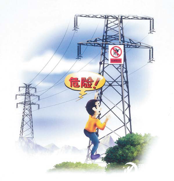 私自攀爬電線桿、電力鐵塔(特別是高電壓等級 的),只要超過安全距離,即使不碰到導線,也會有觸電 的危險。每年各地都偶爾會出現青少年因采取爬桿塔 的另類方式進行求愛、輕生等而觸電身亡的事故,請吸 取教訓、珍惜生命,勿忽視警示標志。