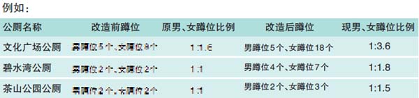 根據相關統計數據顯示,女性如廁 時間比男性平均多1.5 倍,當女廁位與 男廁位一樣多時,就會出現女性排隊上 廁所的情況。市城管局有關負責人告 訴記者,早在2014 年,我市政協委員周 建生在提交的提案中就指出,我市公廁 存在男女公廁比例不夠合理的問題。 目前,經過升級改造,該局公廁管理隊 管護的69 間市政公廁,除個別因位置等 原因無法改造的,其他大多實現了男女 蹲位1:1.5的比例。