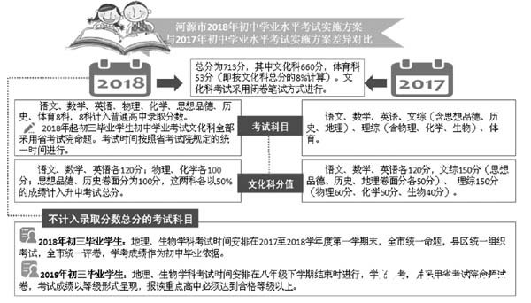 《意見》的出臺,引發我市不 少考生和家長的關注,那么我市 明年的中考政策會不會有很大 的變化呢?記者了解到,我市已 于日前公布了《河源市2018 年初 中學業水平考試實施方案》(以 下簡稱《方案》)。《方案》對我市 2018 年中考的報考資格、報考辦 法和資格審查、考試科目及分值 進行了說明。市教育局相關科 室負責人表示,未來,我市將會 根據國家教育部和廣東省文件 精神,結合本市實際情況,在指 標生分配比例、自主招生等方面 作出調整。