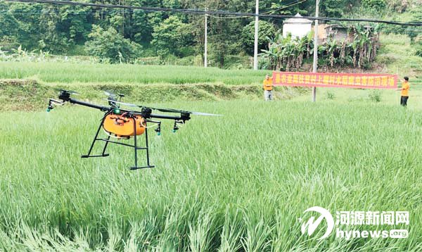 近日,在龍川縣四都鎮(zhèn)上榴村,農(nóng)技人員正在用兩臺植保無人機對該村的150 畝農(nóng)田噴藥作業(yè)。據(jù)了解,該縣參與植 保的鄉(xiāng)鎮(zhèn)有麻布崗、赤光、龍母、四都、登云等8 個鎮(zhèn),共有兩萬多畝農(nóng)田使用植保無人機噴灑農(nóng)藥,以此有效防治水稻病蟲 害的發(fā)生。